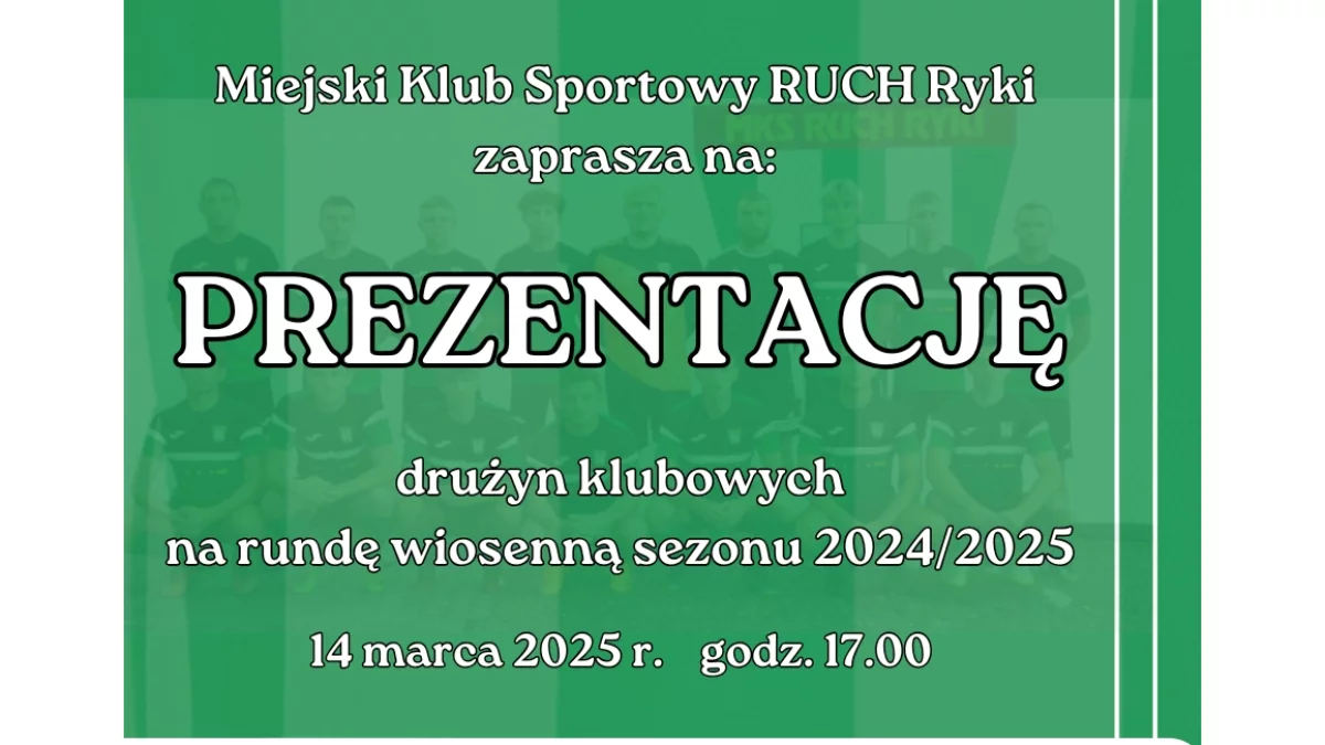 W hali Centrum Kultury i Sportu w Rykach odbędzie się pierwsza w historii klubu prezentacja zespołów Ruchu Ryki. Przed kibicami zaprezentuje się drużyna seniorów, ale również wszystkie zespoły młodzieżowe występujące w biało-zielonych barwach.