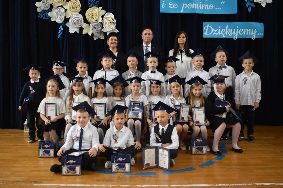 Nie zabrakło także wzruszeń i ciepłych słów skierowanych do najmłodszych uczniów. Dyrektor szkoły pogratulował im odwagi i życzył wielu sukcesów, radości ze zdobywania wiedzy oraz samych wspaniałych chwil spędzonych w murach szkoły. Rodzice z dumą obserwowali swoje pociechy, które po raz pierwszy stanęły na szkolnej scenie.