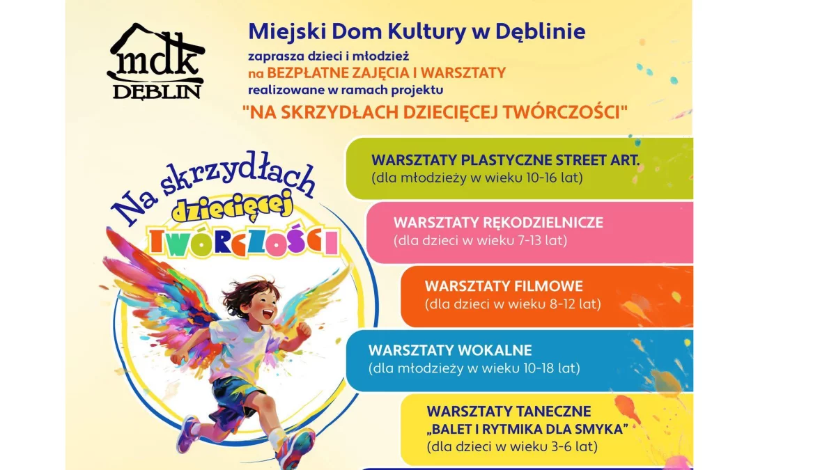 Projekt "Na skrzydłach dziecięcej twórczości" to doskonała okazja, by młodzi mieszkańcy Dęblina mogli twórczo spędzać czas, rozwijać swoje pasje i poznawać nowe dziedziny sztuki. Warto skorzystać!