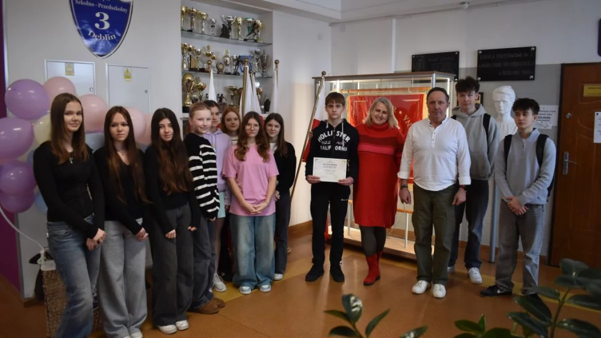 Nagrodę wręczył dyrektor placówki, dr Krzysztof Gogacz, w obecności obecnych ósmoklasistów oraz byłej wychowawczyni Michała, Justyny Zając.