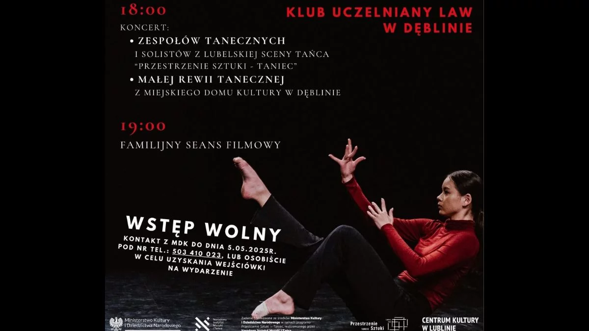 Wydarzenie rozpocznie się o godzinie 18:00 koncertem zespołów tanecznych i solistów z Lubelskiej Sceny Tańca "Przestrzenie Sztuki - Taniec" oraz Małej Rewii Tanecznej z Miejskiego Domu Kultury w Dęblinie.