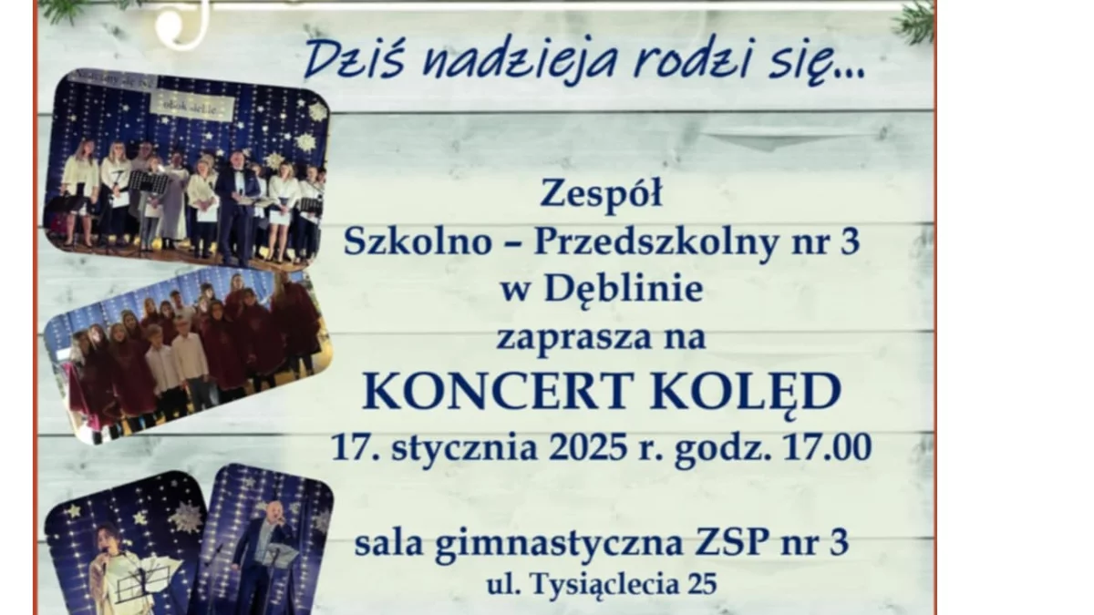 Organizatorzy koncertu zapraszają wszystkich kochających świąteczne piosenki do Zespołu Szkolno-Przedszkolnego nr 3, przy ul. Tysiąclecia 25 w Dęblinie. 17 stycznia o godz. 17.00.