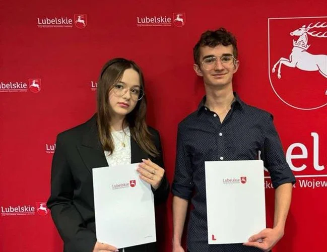 Dyplomy stypendialne wręczył Michalinie i Marcelowi członek zarządu Województwa Lubelskiego - Marcin Szewczak.