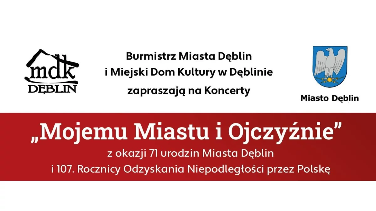Z okazji 71. urodzin miasta oraz 107. Rocznicy Odzyskania Niepodległości Burmistrz Dęblina wraz z Miejskim Domem Kultury zapraszają mieszkańców na koncerty pod hasłem „Mojemu Miastu i Ojczyźnie”.