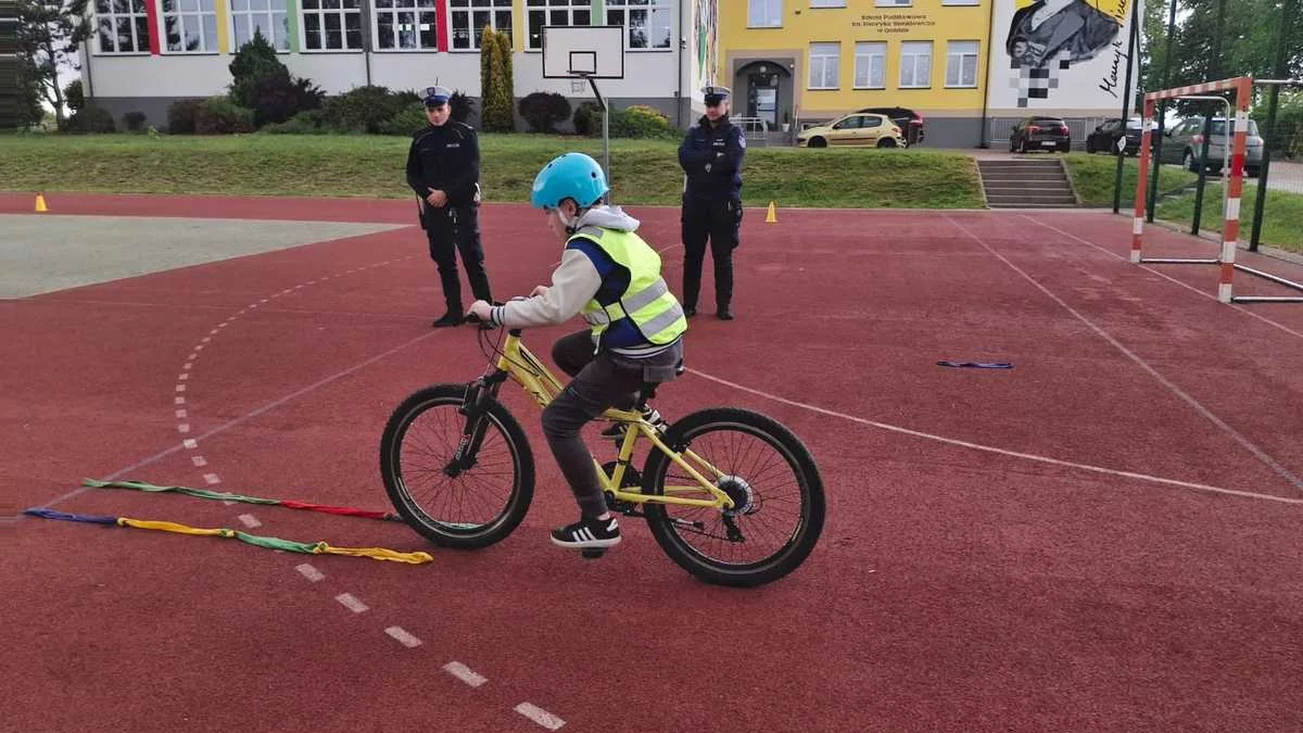 Uczniowie Szkoły Podstawowej w Goździe przystąpili do praktycznego egzaminu na kartę rowerową. Na szkolnym boisku przygotowano specjalny tor sprawnościowy oraz miasteczko ruchu drogowego, gdzie funkcjonariusze policji oceniali, czy młodzi rowerzyści potrafią stosować się do znaków drogowych oraz bezpiecznie poruszać się po skrzyżowaniach.