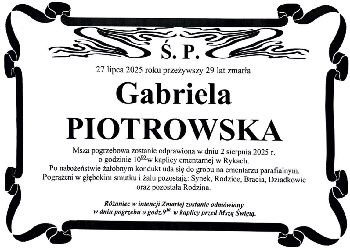 Z POWIATU RYCKIEGO27 lipca zmarła Gabriela Piotrowska. Miała 29 lat. Rodzinie oraz wszystkim bliskim składamy wyrazy współczucia.
