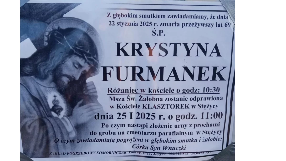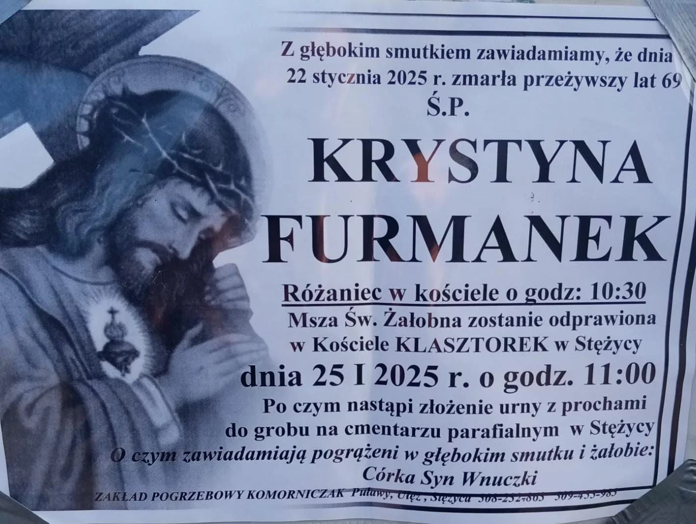 Z POWIATU RYCKIEGO22 stycznia zmarła Krystyna Furmanek. Miała 69 lat.