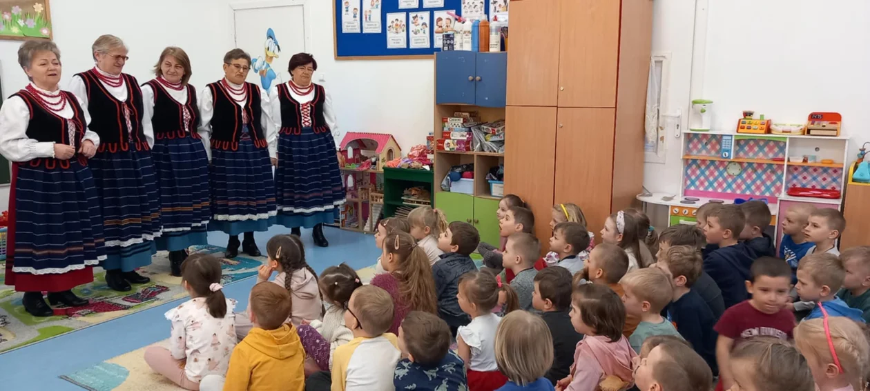 Panie zaprezentowały dzieciom stroje i twórczość ludową poprzez śpiew taniec. Przedszkolaki dowiedziały się jakie materiały są potrzebne do stworzenia własnej palmy, a co najważniejsze mogły czynnie uczestniczyć w przygotowaniach wielkanocnych palm.