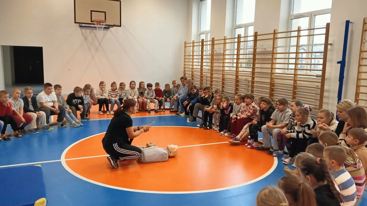 Uczniowie klas I–VIII mieli okazję uczestniczyć w zajęciach z udzielania pierwszej pomocy przedmedycznej, które przeprowadziła nauczycielka techniki i wychowania fizycznego. Podczas spotkania uczestnicy utrwalali wiedzę na temat łańcucha ratunkowego, ze szczególnym naciskiem na prawidłowe wykonywanie resuscytacji krążeniowo‑oddechowej (RKO).