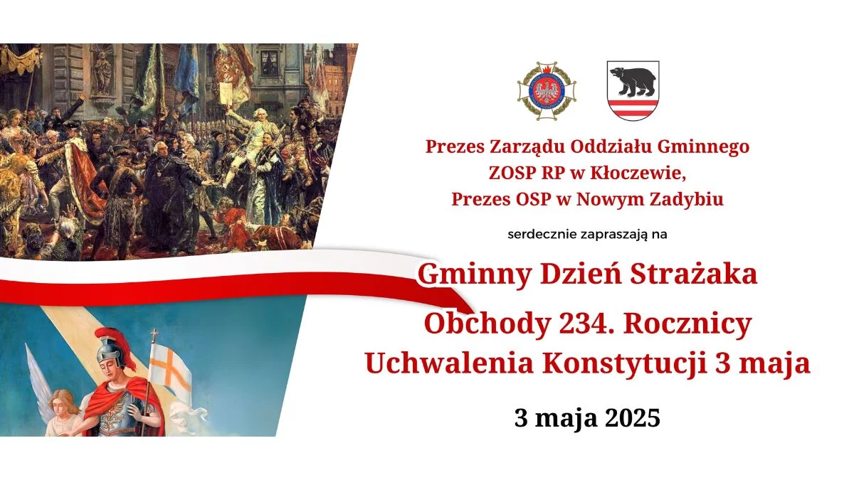 Prezes Zarządu Oddziału Gminnego ZOSP RP w Kłoczewie i prezes OSP w Nowym Zadybiu zapraszają na Gminny Dzień Strażaka i obchody 234. rocznicy uchwalenia Konstytucji 3 maja.