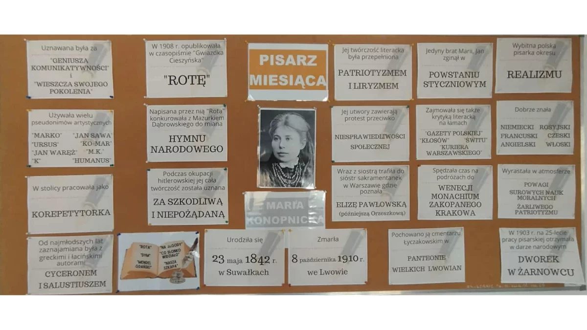 Celem zajęć było przybliżenie uczniom postaci autorki znanej z wrażliwości i empatii do drugiego człowieka, umiłowania do ojczyzny oraz języka ojczystego. Na szkolnej gazetce przedstawiono najważniejsze informacje z życia Marii Konopnickiej i jejdorobku literackiego.