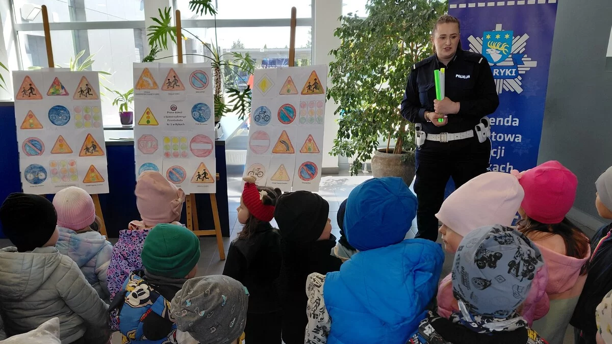 Wizyta dzieci w komendzie była zwieńczeniem wcześniejszych zajęć z policjantką drogówki, podczas których najmłodsi poznawali podstawowe zasady bezpiecznego poruszania się po drogach. Zdobyta wiedza stała się inspiracją do stworzenia kolorowych prac plastycznych przedstawiających znaki drogowe.