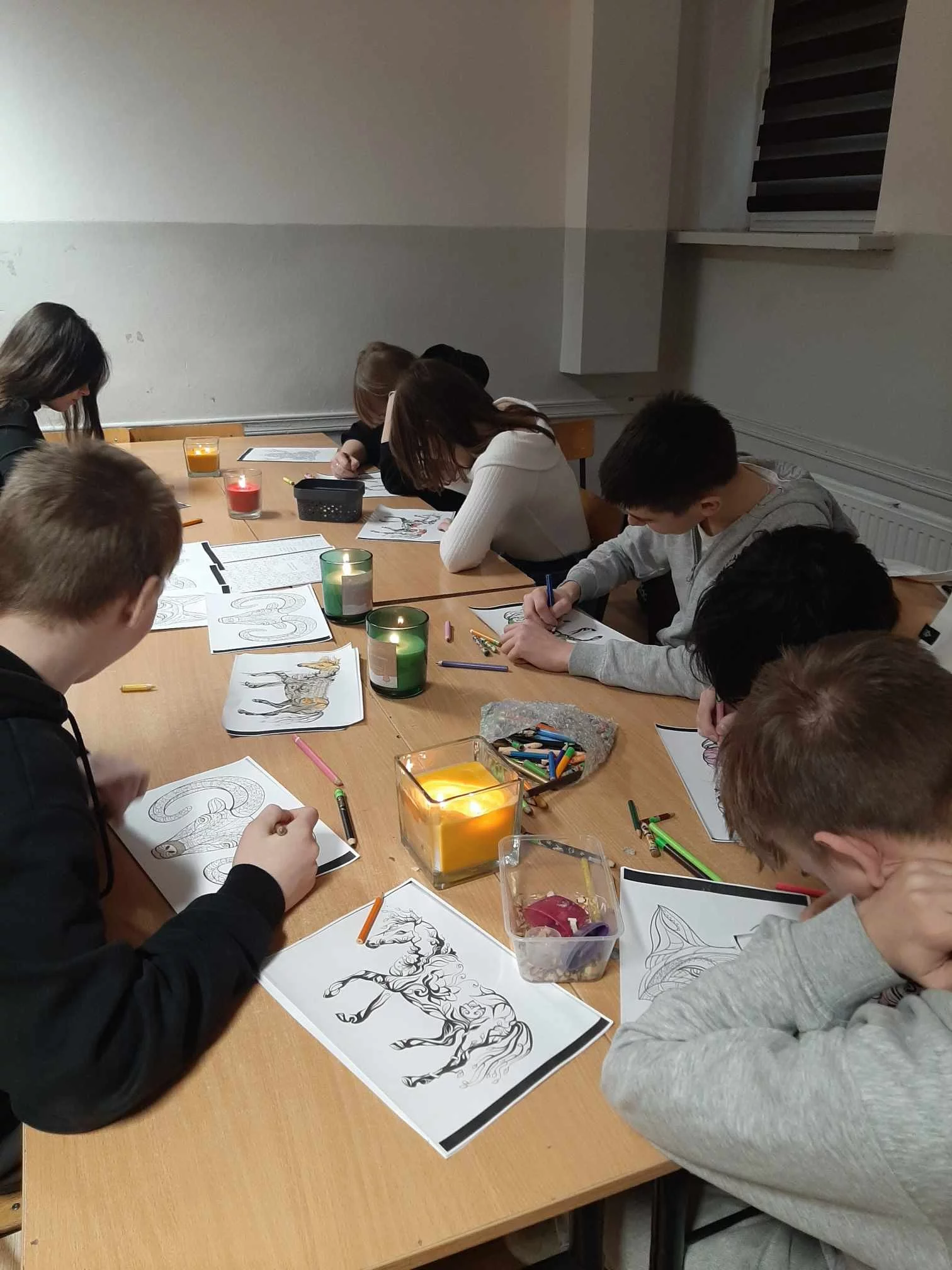 Opiekunki Samorządu Szkolnego – p. J. Kozłowska, p. A. Marciniak, p. M. Polak oraz p. A. Wesołowska-Oleksy – przeprowadziły Godzinę Relaksacji w klasach 1fsb, 2fs, 3dt, 4et oraz 5act. Uczniowie mieli okazję malować kolorowanki antystresowe, słuchać relaksacyjnej muzyki oraz poznawać proste metody redukcji napięcia, które jednocześnie wzmacniają koncentrację i uważność.