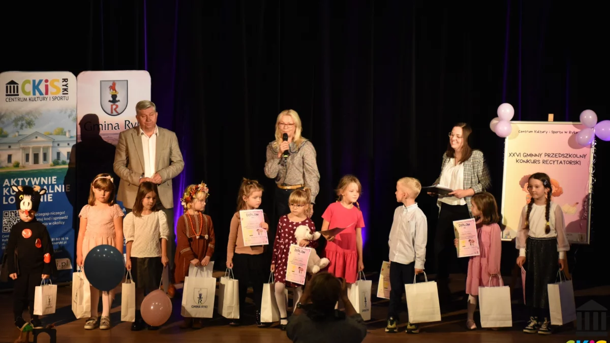 W środę, 8 października w Kinie Renesans w Rykach, odbył się XXVI Gminny Przedszkolny Konkurs Recytatorski, zorganizowany przez Centrum Kultury i Sportu w Rykach. Konkurs zgromadził 34 młodych recytatorów z gminy Ryki, którzy zaprezentowali swoje umiejętności recytatorskie z dużym zaangażowaniem i urokiem, interpretując wiersze dziecięce.