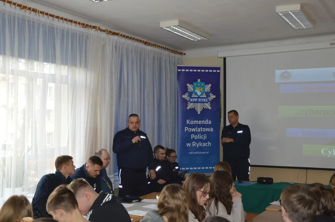 Jak poinformował asp. Łukasz Filipek, w spotkaniu zorganizowanym w Zespole Szkół Zawodowych nr 2 w Rykach uczestniczył nadkomisarz Łukasz Walo I Zastępca Komendanta Powiatowego Policji w Rykach oraz zaproszeni goście w tym Dyrektor Zespołu Szkół Zawodowych nr 2 w Rykach Hanna Markiewicz, Dyrektor I Liceum Ogólnokształcącego w Rykach Mariusz Grzelak, Dyrektor Zespołu Szkół Zawodowych nr 1 w Rykach Grzegorz Kamiński, Dyrektor Poradni Psychologiczno-Pedagogicznej w Rykach Mirosława Brasławska-Haque oraz przedstawiciele Starostwa Powiatowego w Rykach, Powiatowego Centrum Pomocy w Rodzinie w Rykach i I Zespołu Kuratorskie Służby Sądowej w Rykach. Naszymi gośćmi była również młodzież wraz z gronem pedagogicznym ze wszystkich szkół średnich z Ryk oraz Sobieszyna. Specjalnym gościem oraz prelegentem była młodsza aspirant Małgorzata Skowrońska z Centralnego Biura Zwalczania Cyberprzestępczości.