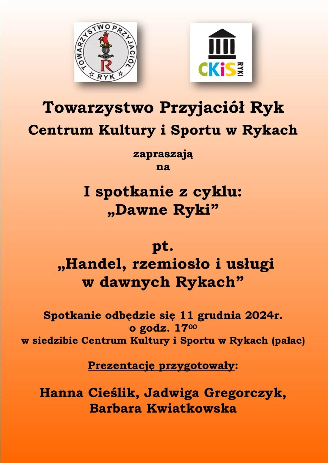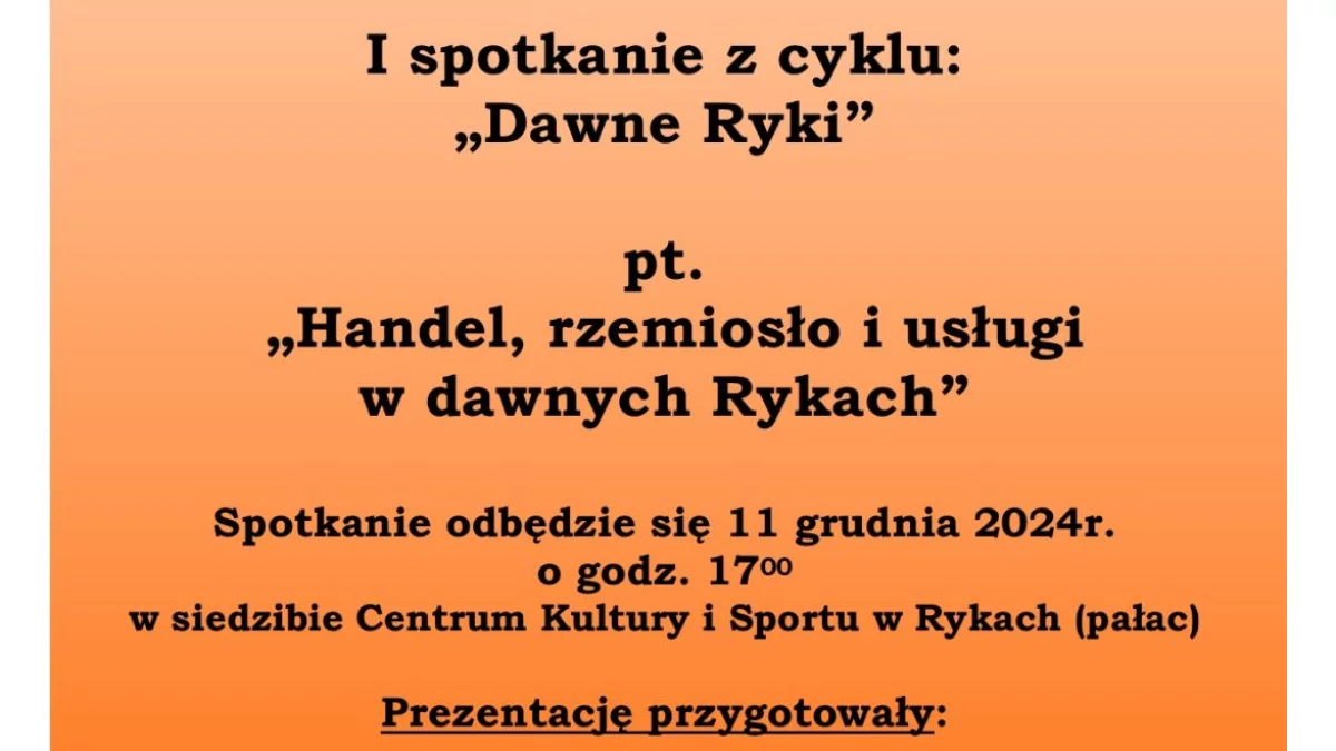 Spotkanie odbędzie się w środę, 11 grudnia, o godzinie 17:00 w siedzibie Centrum Kultury i Sportu w Rykach. Tytuł spotkania to „Handel, rzemiosło i usługi w dawnych Rykach”.