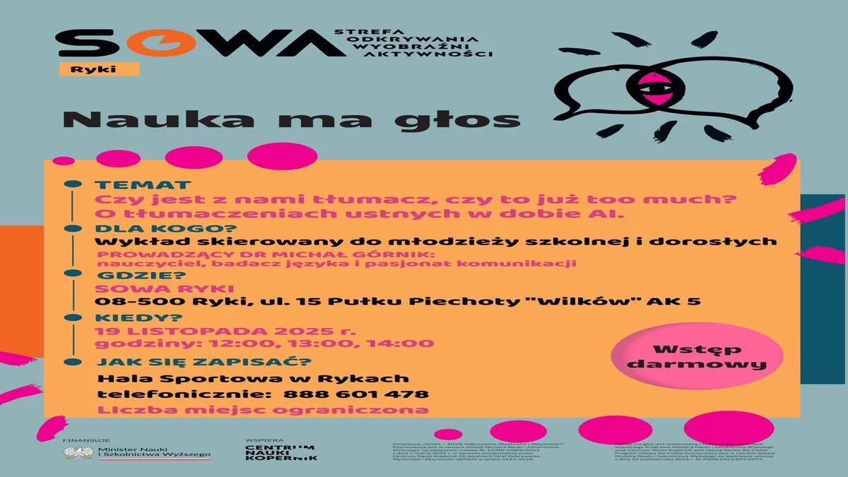 W ramach cyklu „Nauka ma głos” 19 listopada 2025 roku odbędzie się wykład pod hasłem: „Czy jest z nami tłumacz, czy to już too much? O tłumaczeniach ustnych w dobie AI”. Spotkanie poprowadzi dr Michał Górnik – nauczyciel, badacz języka i pasjonat komunikacji.