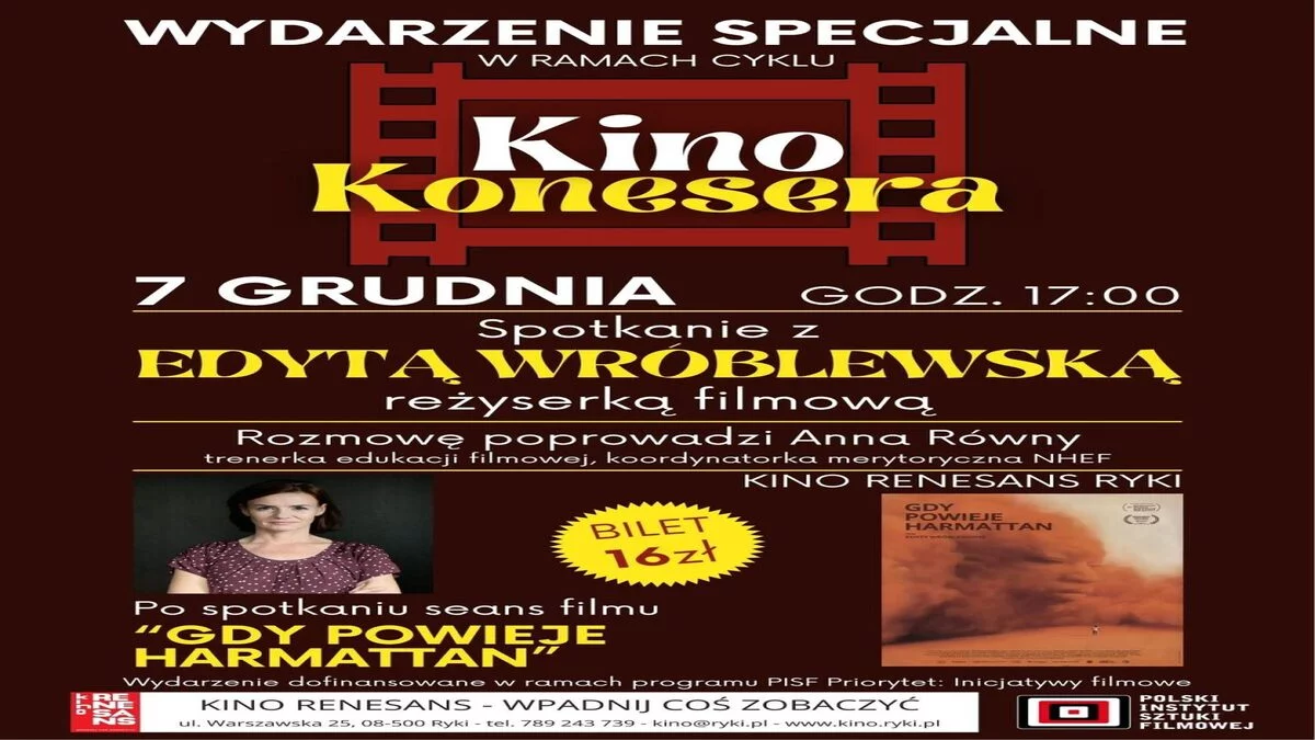 Po spotkaniu widzowie będą mogli obejrzeć film „Gdy powieje harmattan” w reżyserii Edyty Wróblewskiej. Bilety wstępu na wydarzenie kosztują 16 zł. Organizatorem przedsięwzięcia jest Kino Renesans w Rykach. To wydarzenie to ciekawa propozycja dla miłośników kina, którzy chcą poznać film z perspektywy jego autorki.