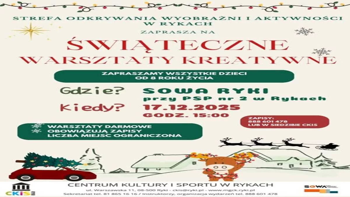 Strefa Odkrywania Wyobraźni i Aktywności w Rykach zaprasza dzieci od 8. roku życia na Świąteczne Warsztaty Kreatywne, które odbędą się 17 grudnia o godzinie 15:00. Zajęcia zostaną przeprowadzone w siedzibie SOWY przy Publicznej Szkole Podstawowej nr 2 w Rykach, przy ul. 15 Pułku Piechoty „Wilków” Armii Krajowej 5.
