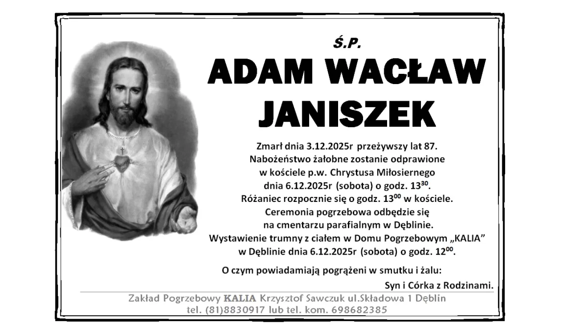 ZMARLI3 grudnia zmarł Adam Wacław Janiszek. Przeżył 87 lat.