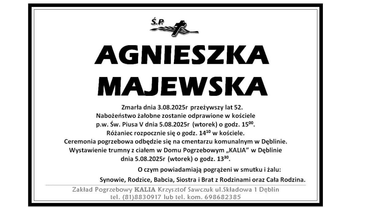 ZMARLI3 sierpnia umarła Agnieszka Majewska. Przeżyła 52 lata.