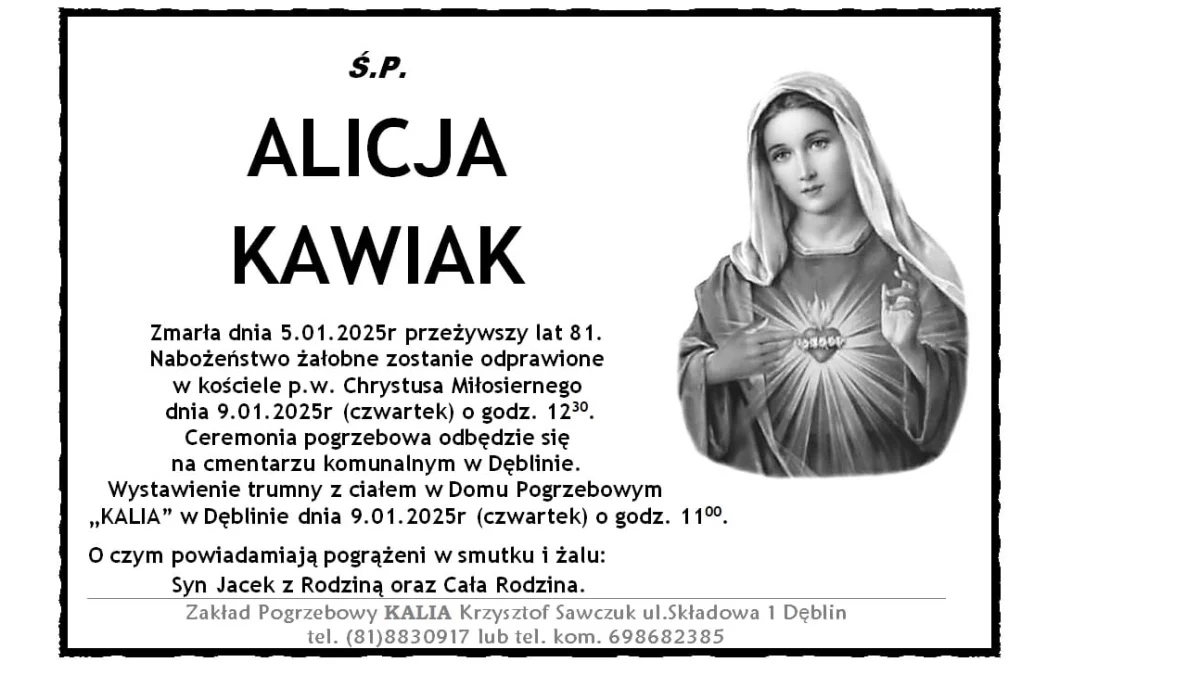 Wystawienie trumny z ciałem w Domu Pogrzebowym "Kalia" w Dęblinie 9 stycznia o godz. 11:00. Ceremonia pogrzebowa odbędzie się na cmentarzu komunalnym w Dęblinie.