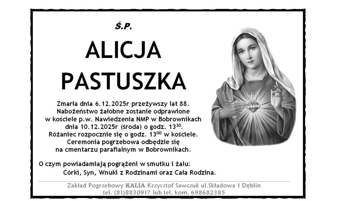 ZMARLI6 grudnia zmarła Alicja Pastuszka. Przeżyła 88 lat.