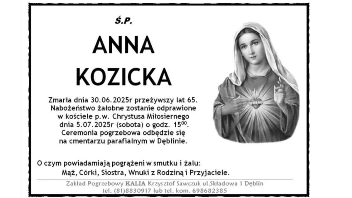 ZMARLI30 czerwca zmarła Anna Kozicka. Miała 65 lat.