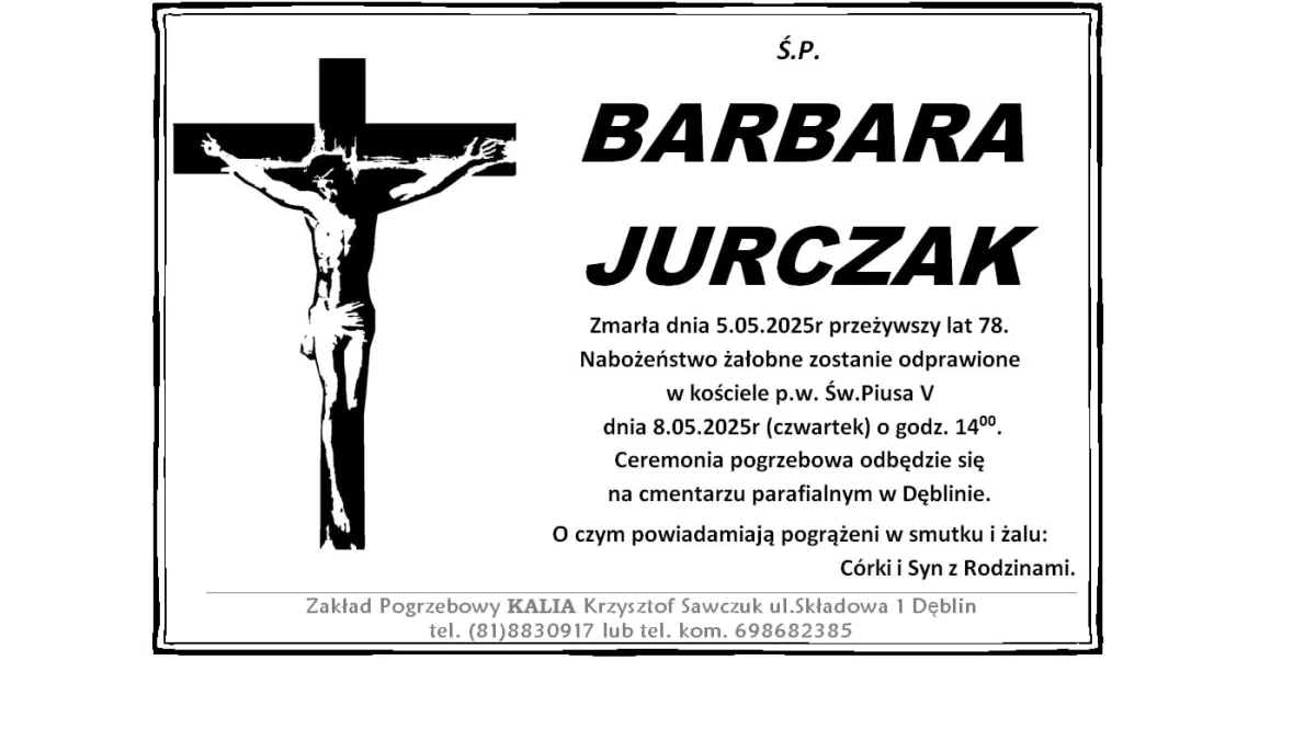 ZMARLIPrzeżyła 78 lat. Wyrazy współczucia dla bliskich Barbary Jurczak.