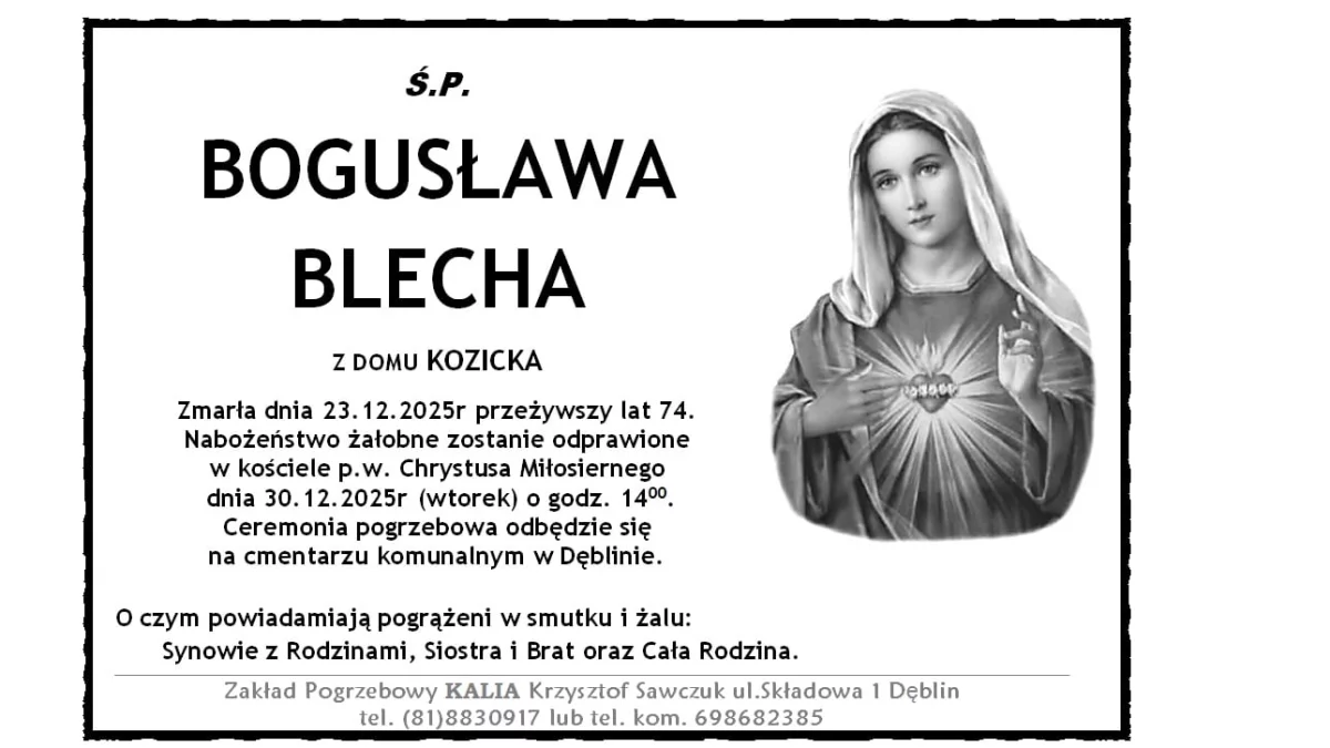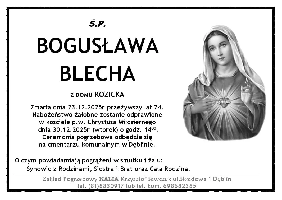 ZMARLI23 grudnia zmarła Bogusława Blecha z domu Kozicka. Przeżyła 74 lata.