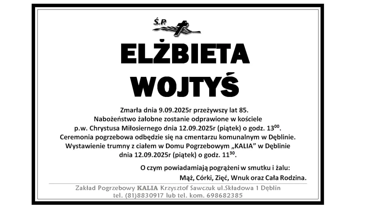 ZMARLI9 września zmarła Elżbieta Wojtyś. Przeżyła 85 lat.
