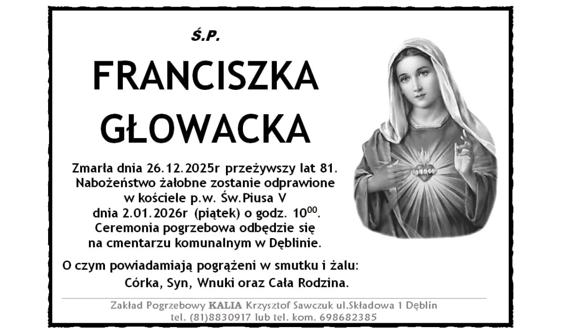 ZMARLI26 grudnia zmarła Franciszka Głowacka. Przeżyła 81 lat.