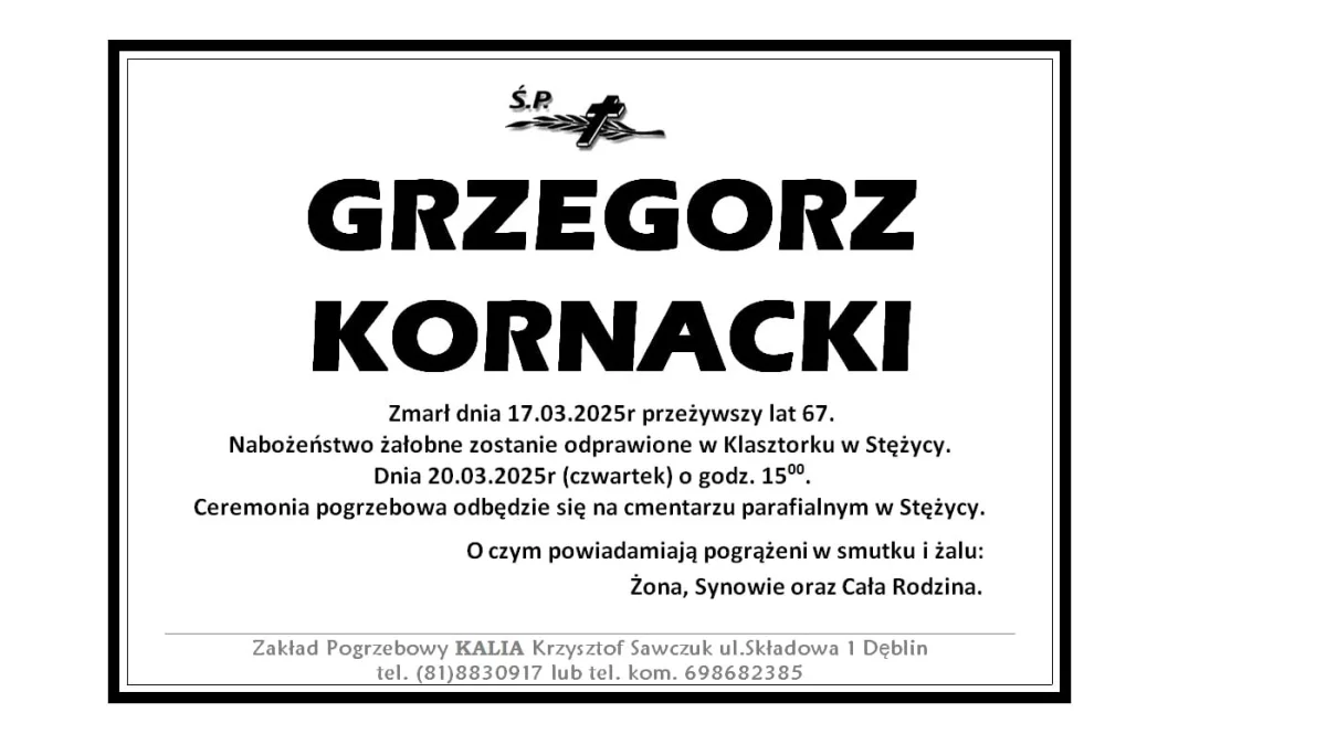 ZMARLI17 marca zmarł Grzegorz Kornacki. Miał 67 lat.