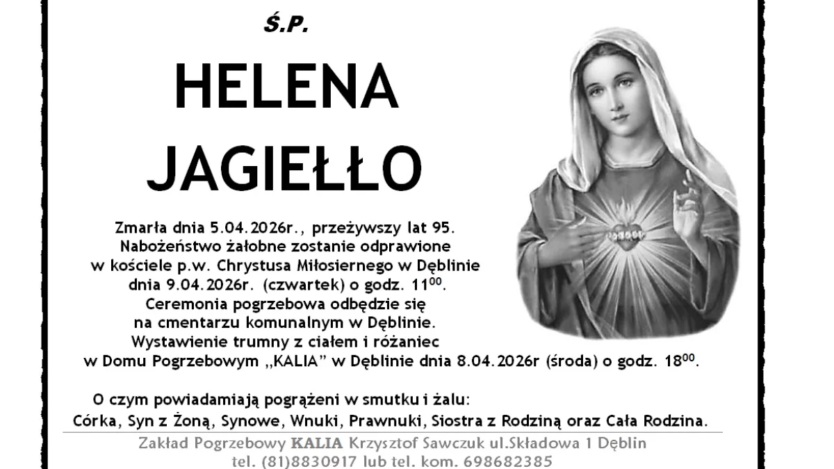 O śmierci Heleny Jagiełło poinformowała pogrążona w smutku rodzina: córka, syn z żoną, synowe, wnuki, prawnuki, siostra z rodziną oraz pozostali bliscy.