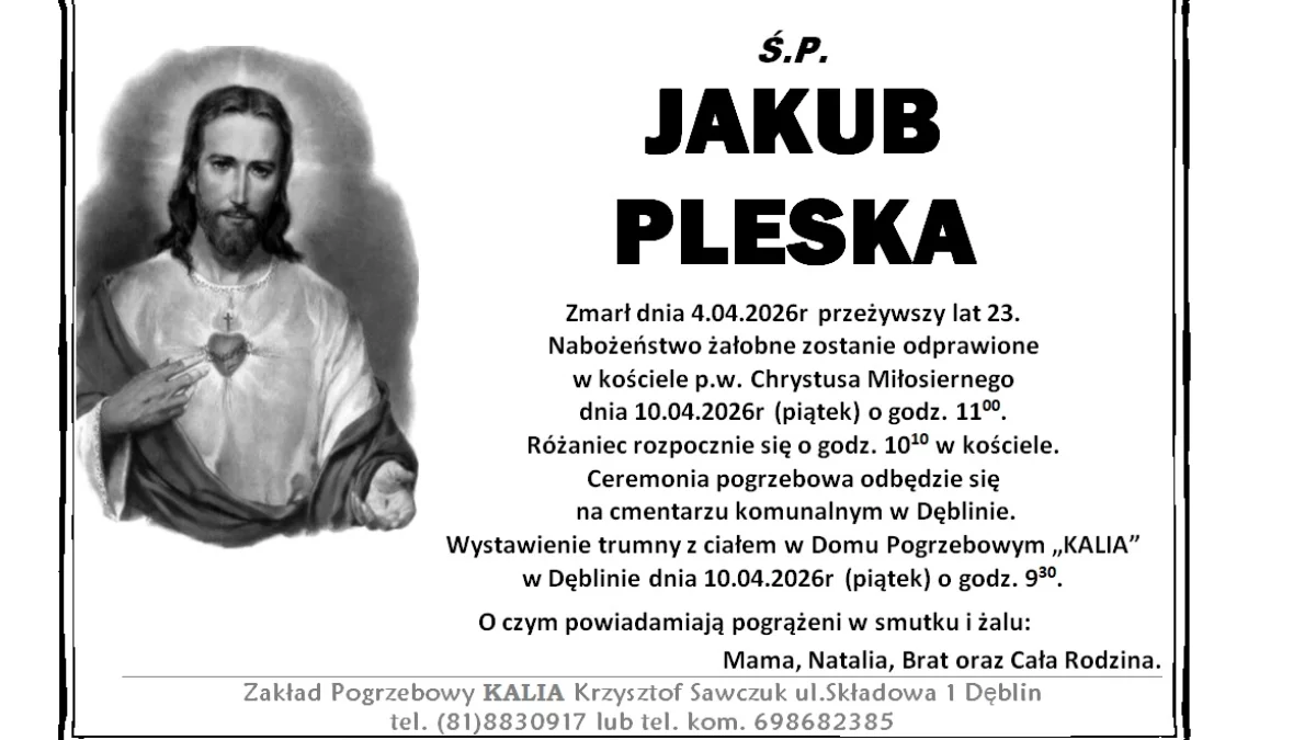 Mieszkańcy Dęblina i okolic mają okazję w piątek dołączyć do wspólnej modlitwy, aby oddać i pożegnać Jakuba z należytą czcią. Ta tragiczna strata przypomina, jak kruche i nieprzewidywalne jest życie, a także jak ważne jest okazywanie bliskim uczuć i wsparcia każdego dnia.