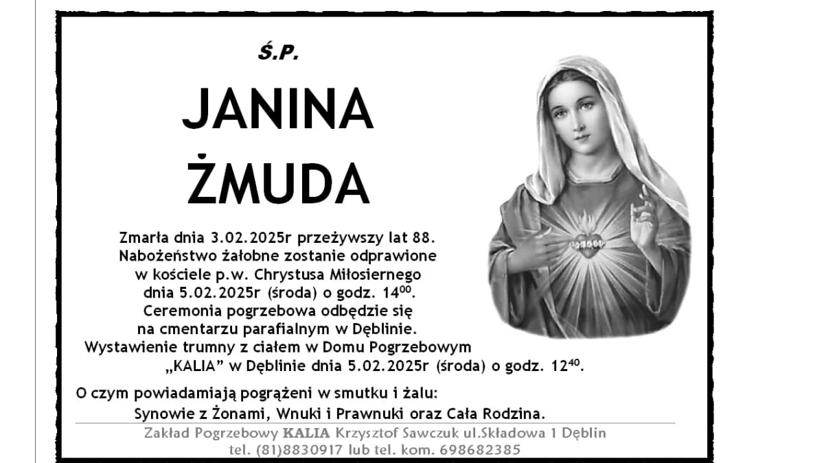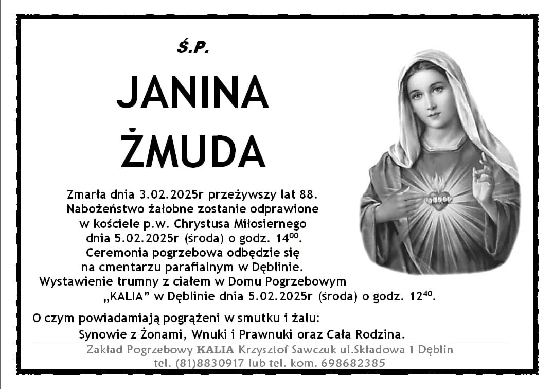 ZMARLI3 lutego zmarła Janina Żmuda. Przeżyła 88 lat.