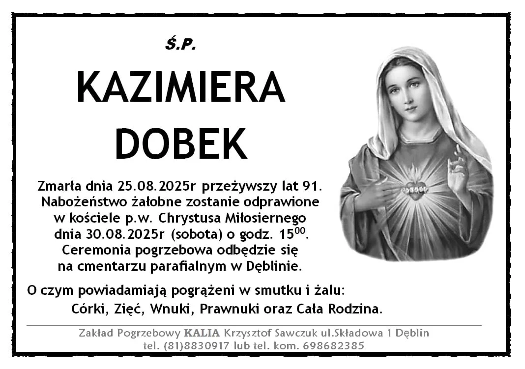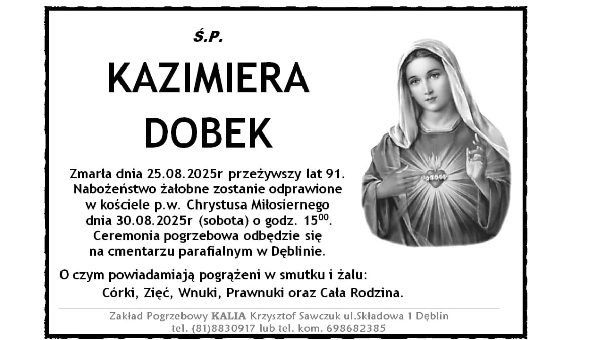 ZMARLI25 sierpnia zmarła Kazimiera Dobek. Przeżyła 91 lat.