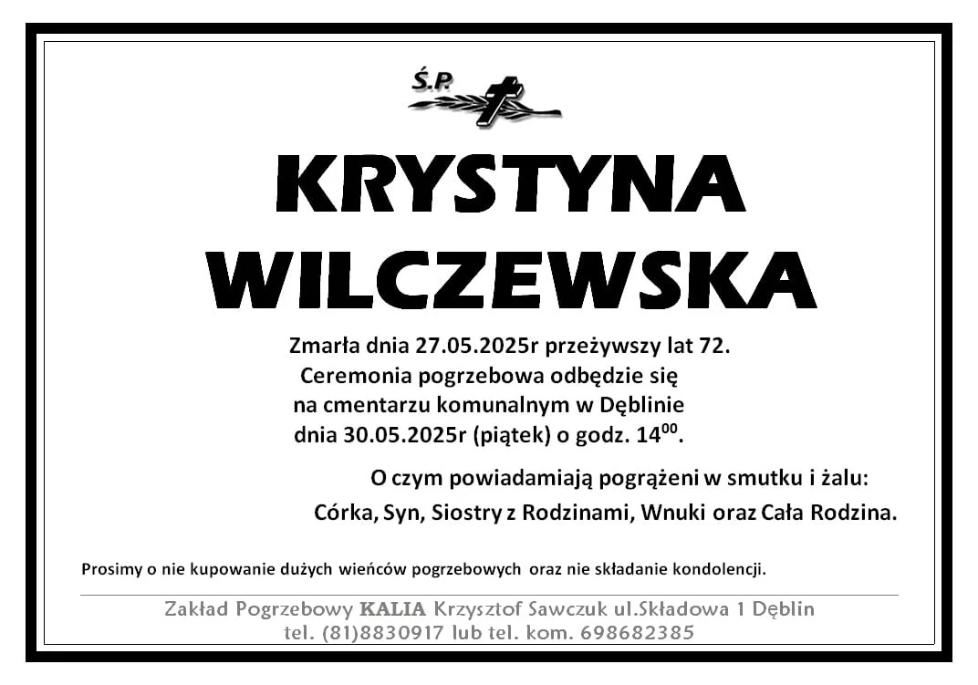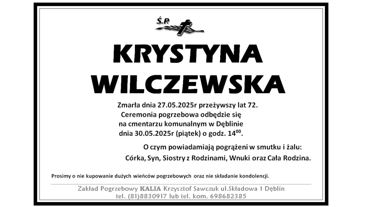 ZMARLI27 maja zmarła Krystyna Wilczewska. Przeżyła 72 lata.