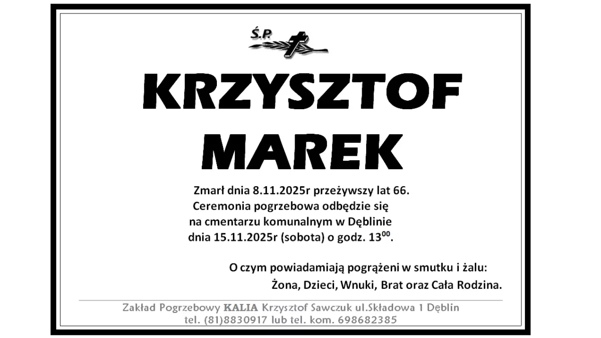 ZMARLI8 listopada zmarł Krzysztof Marek. Przeżył 66 lat.
