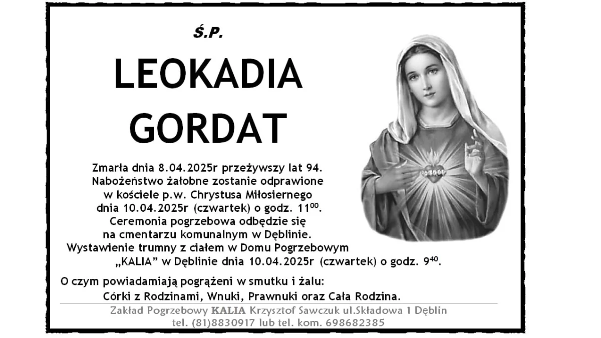 ZMARLI8 kwietnia zmarła Leokadia Gordat. Przeżyła 94 lata.