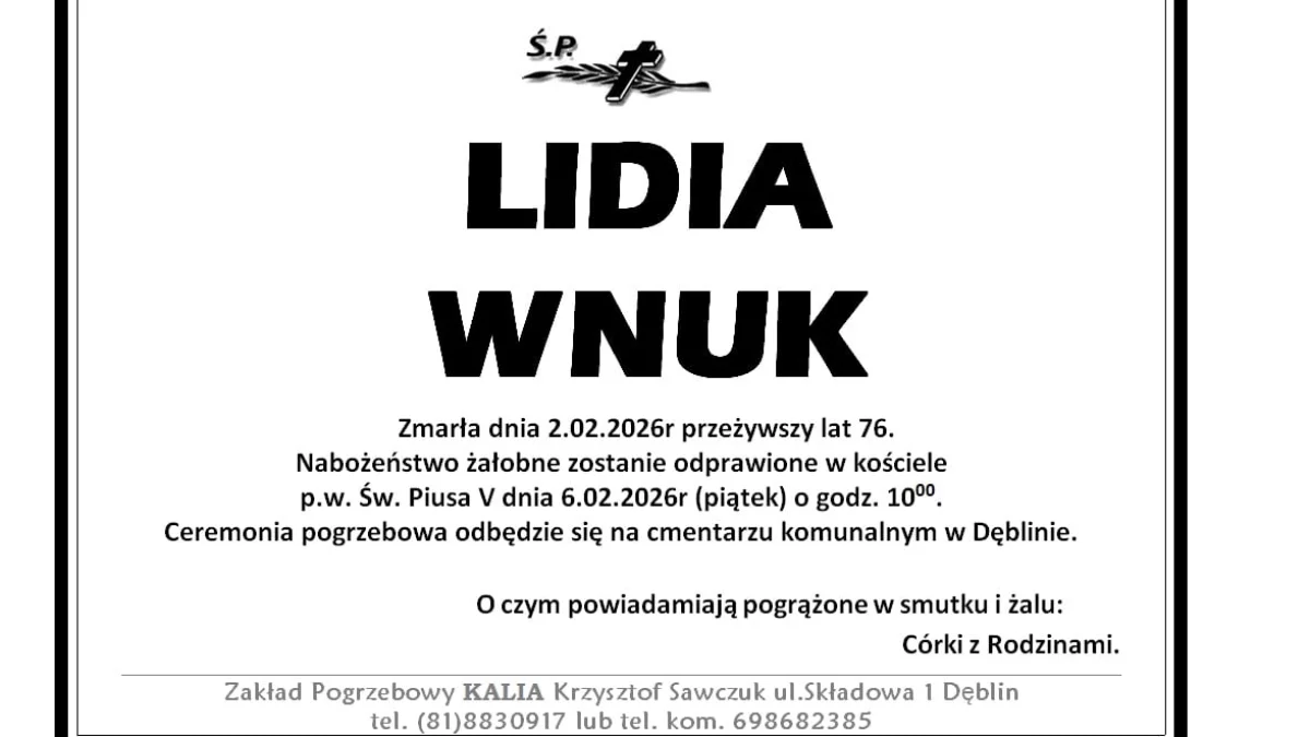 Rodzina prosi wszystkich, którzy chcieliby pożegnać Lidię Wnuk, o wspólną modlitwę i chwilę refleksji nad kruchością ludzkiego życia. W tych trudnych chwilach pogrążone w żalu córki wraz z rodzinami dziękują za okazane wsparcie, kondolencje oraz obecność.