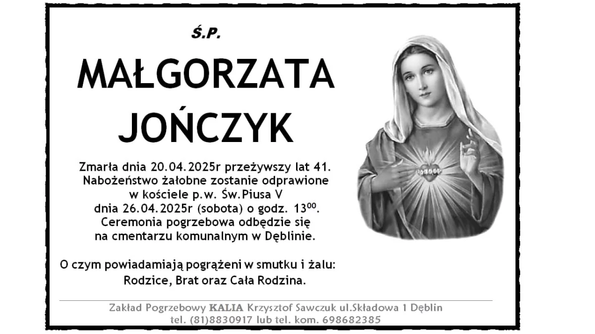 ZMARLI20 kwietnia zmarła Małgorzata Jończyk. Miała 41 lat.