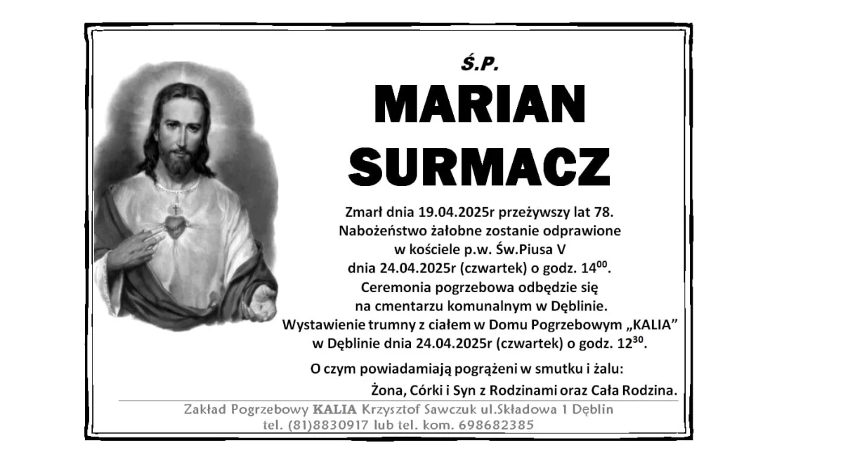 ZMARLI19 kwietnia zmarł Marian Surmacz. Przeżył 78 lat.