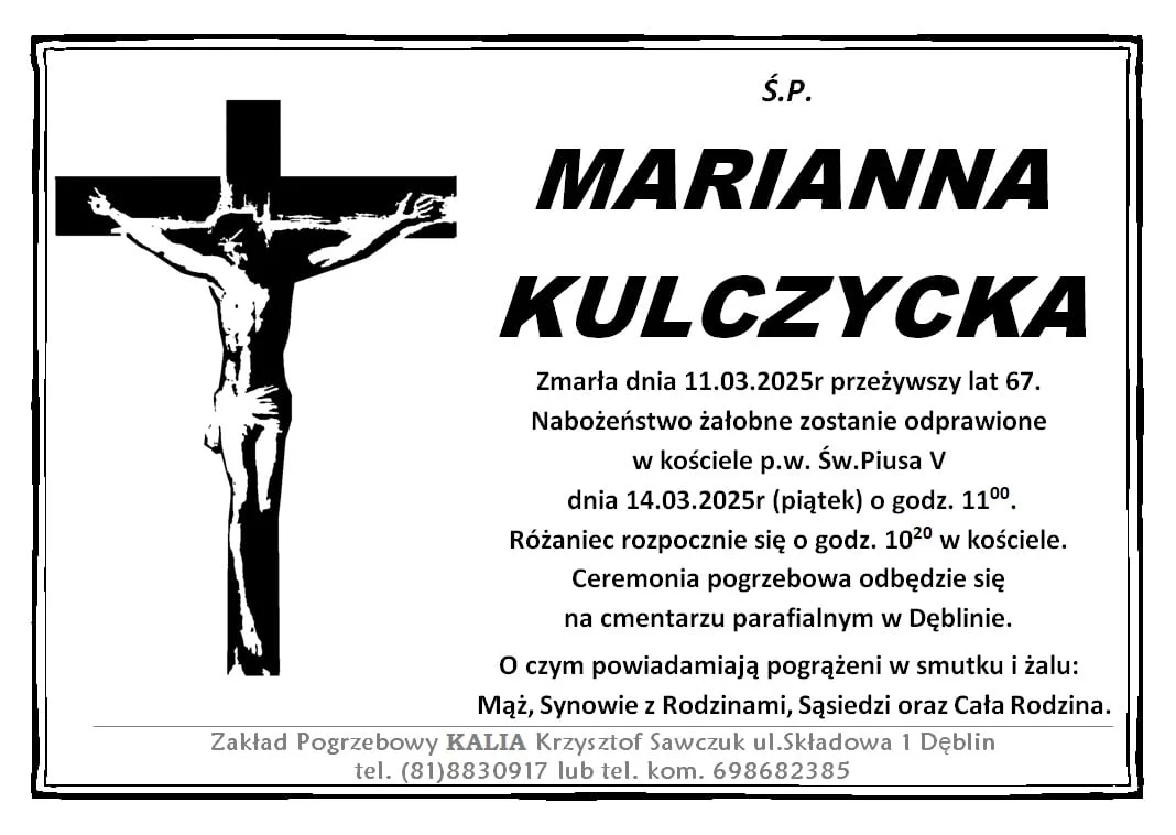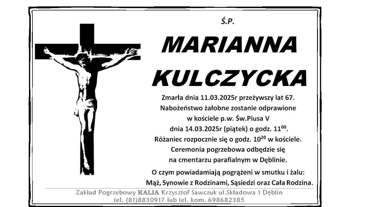 ZMARLI11 marca zmarła Marianna Kulczycka. Przeżyła 67 lat.