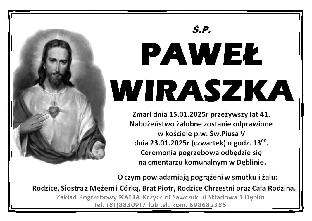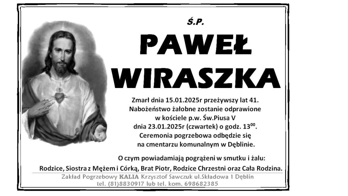 ZMARLI15 stycznia zmarł Paweł Wiraszka. Ostatnie pożegnanie odbędzie się 23 stycznia.