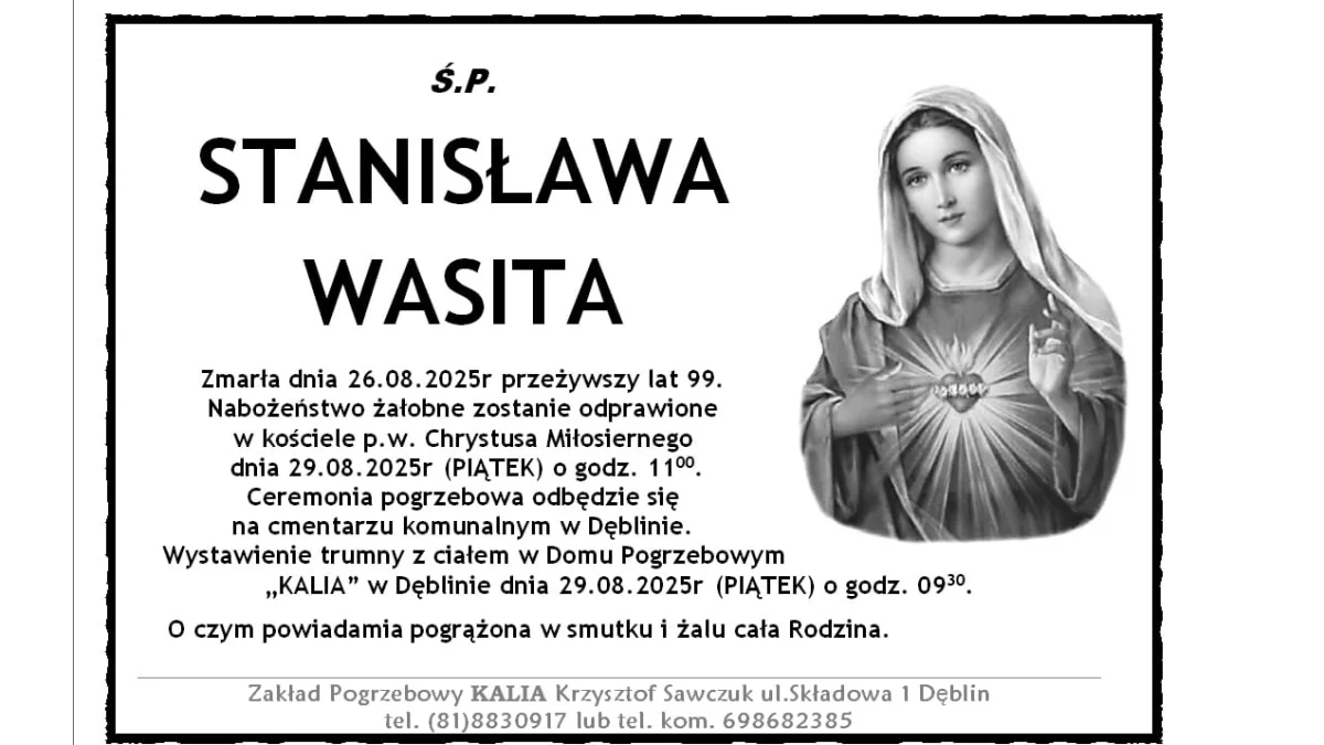 ZMARLI26 sierpnia zmarła Stanisława Wasita. Przeżyła 99 lat.