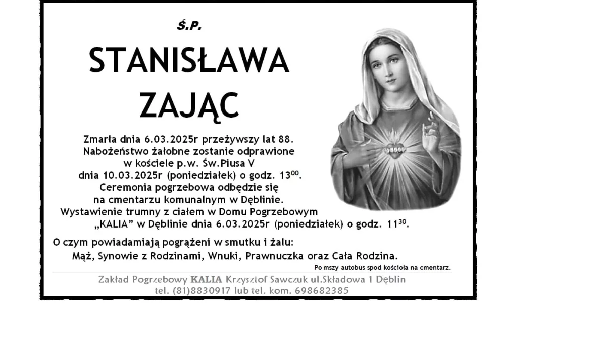 ZMARLI6 marca zmarła Stanisława Zając. Miała 88 lat.