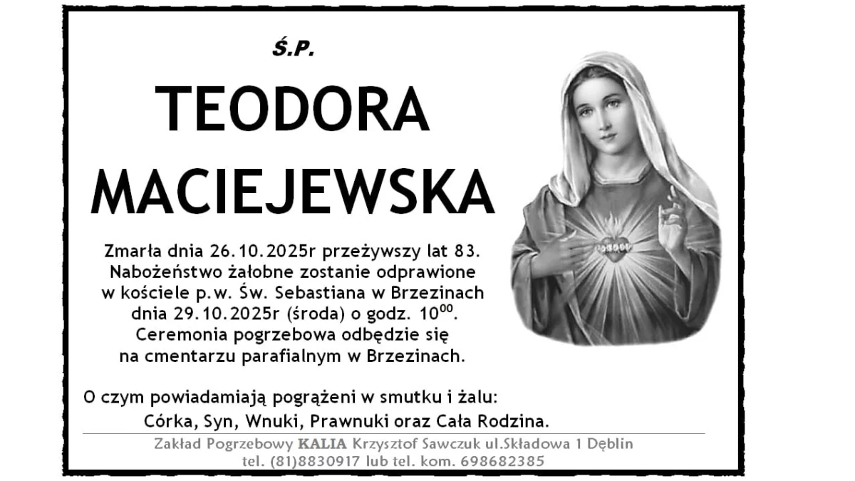 ZMARLI26 października zmarła Teodora Maciejewska. Przeżyła 83 lata.