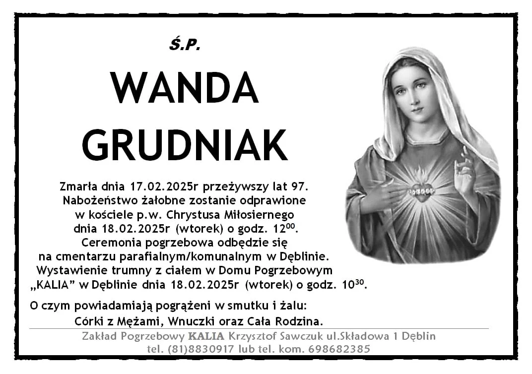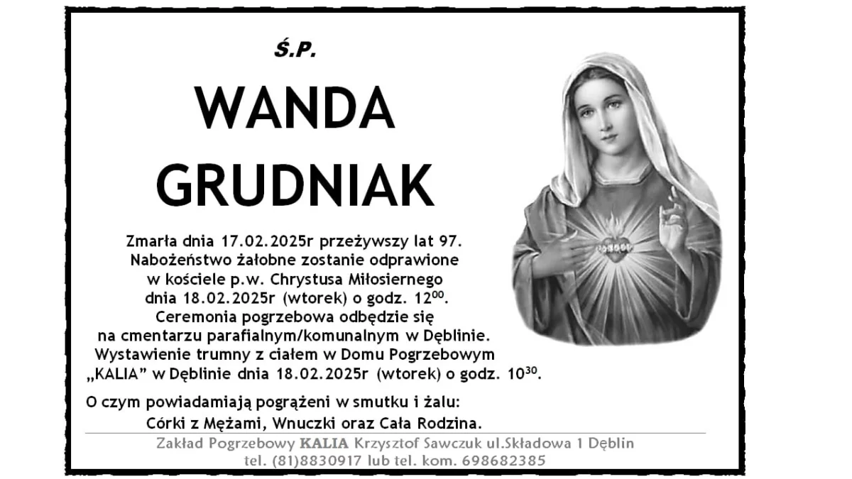 ZMARLI17 lutego zmarła Wanda Grudniak. Przeżyła 97 lat.