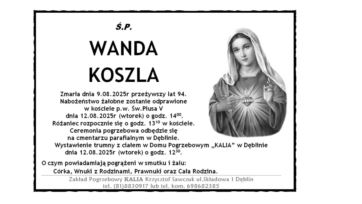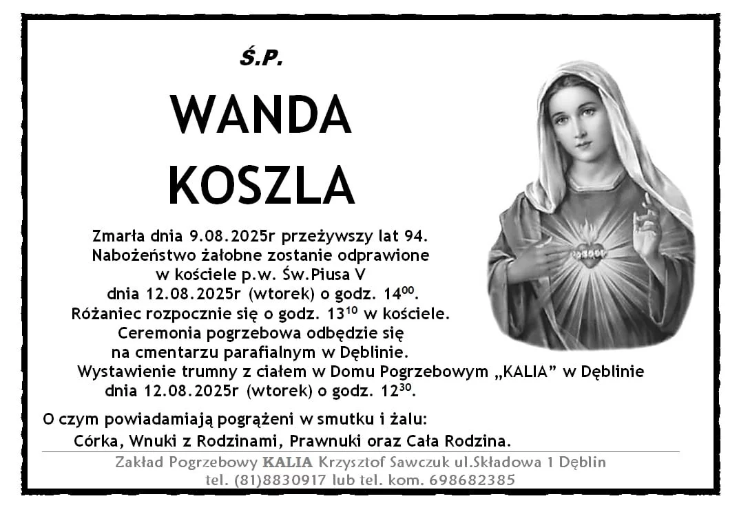ZMARLI9 sierpnia zmarła Wanda Koszla. Miała 94 lata.